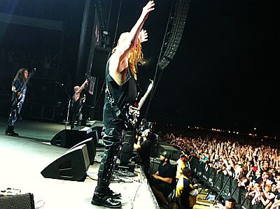 When Slayer hit the stage, the whole show became like one of those CIA experiments where they test the correlation between extreme temperatures and levels of violence. People were going insane, and not necessarily in a fun way. There were brutal fights with guys getting their teeth punched out. One kid with a plaster wrist cast used it to brain some other guy who was clearly freaking out on meth. The pit was huge, and the crush up front (where I was) was unbelievable. I thought my ribs were surely going to break, especially when Tom stepped out past the PA system during one song and was headbanging over the crowd. The whole audience surged his direction, and we were all sardines at that point. Kids were fainting and falling in between us, and we had to hoist them up and pass them over the barricades. I finally felt like I was going to pass out as well, so in desperation I got someone to give me a boost and I crowd-surfed away from the stage to a spot with a little more room to breathe.