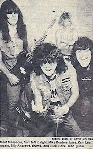 Mike: One day I get a call from Billy Andrews. I was out. No explanation. Bill decided he wanted his best friend Terry Butler to play bass. Funny though, Butler didn't really play bass yet. He played the first few shows with Massacre with the volume off. At the time we were still kids and Massacre was just a metal band in a Florida garage. We had no idea those songs we wrote would end up on an album one day...